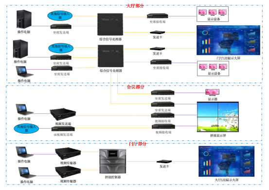 系統內設置有大廳、會議室、前廳和跨地域房間等區域,分散在不同位置,不同地域,同時還有視頻會議、各數據電腦、業務電腦,各區域位置均存在大量的視頻信息。系統需要對所有位置、房間的信息進行統一的監管,需要對分散的信號進行統一采集和整合,不同位置、區域和不同房間要實現互聯互通,資源共享。